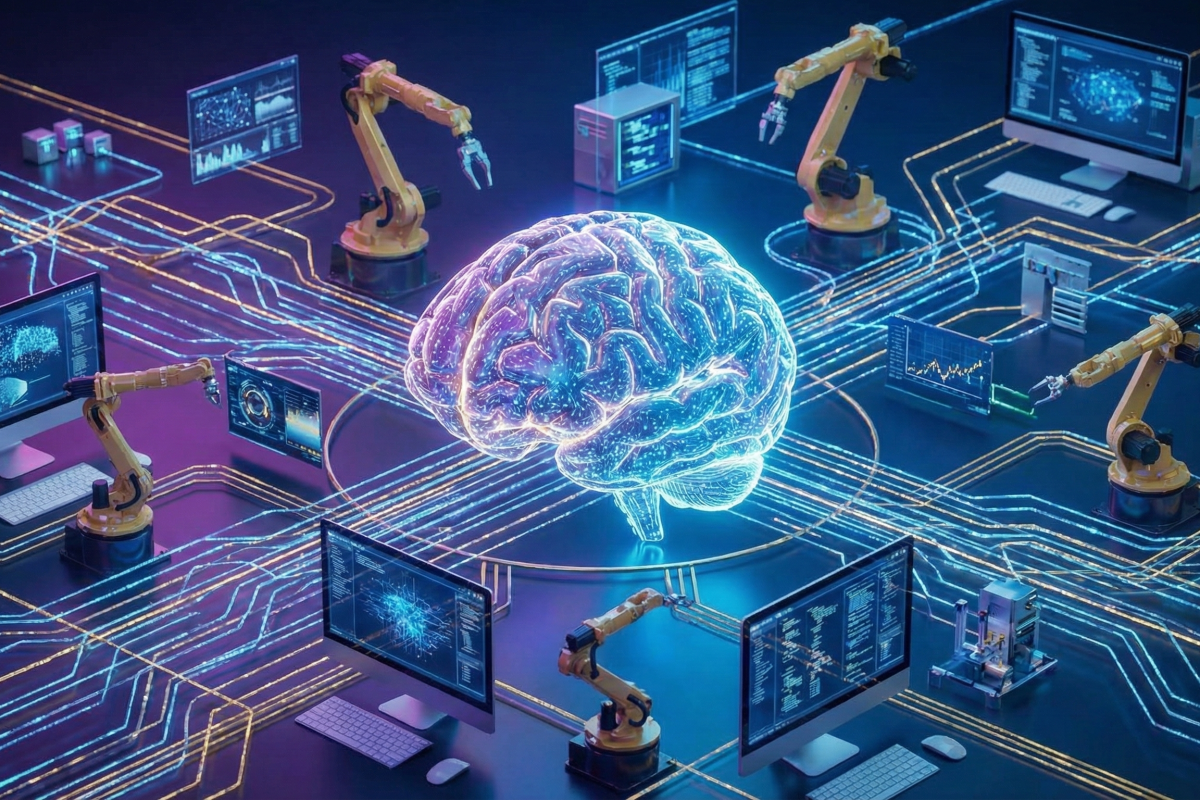 The image below illustrates this concept, with a central AI “brain” coordinating a network of robotic arms and data streams, symbolizing the shift from simple automation to intelligent, autonomous orchestration.